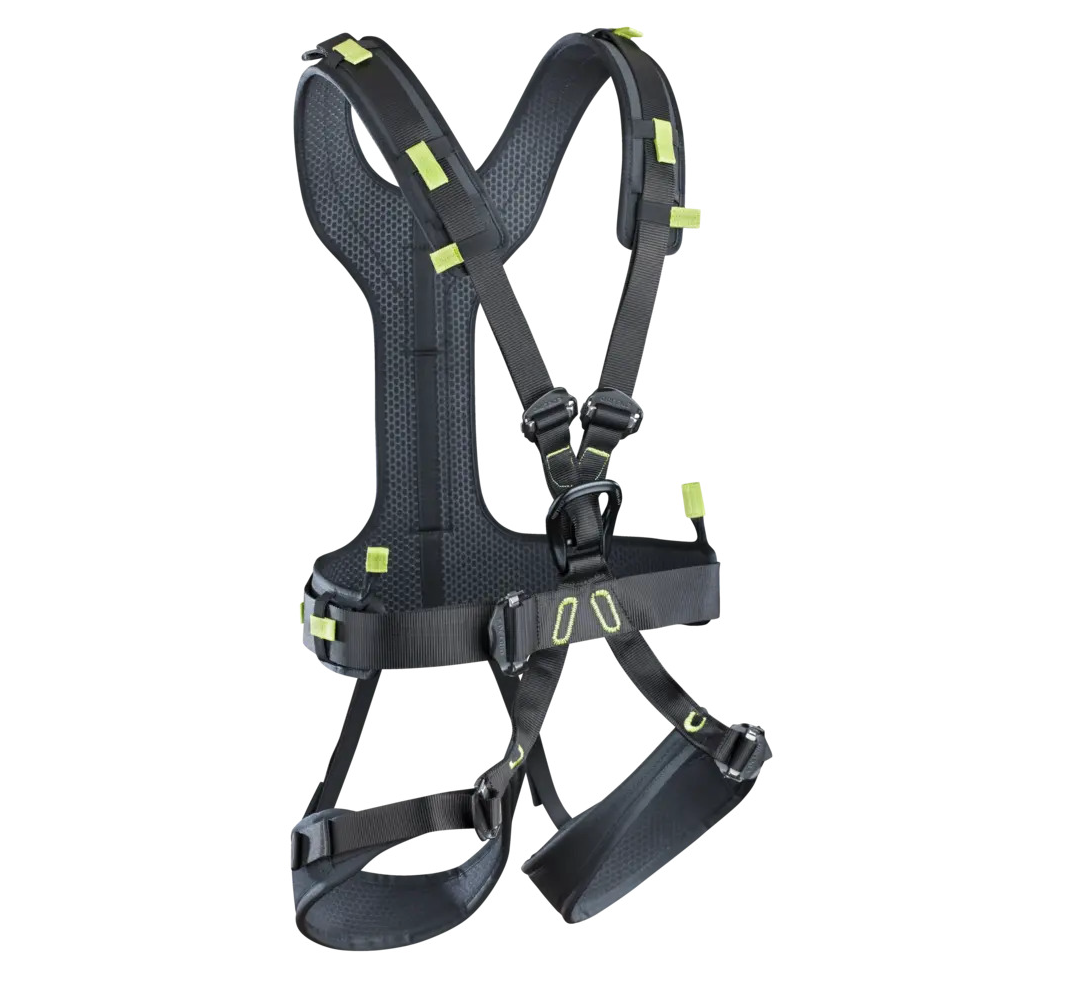 Edelrid Radialis Pro Adjust. Dit is een comfortabel integraal harnas verkrijgbaar in twee maten. Het harnas is geschikt voor onder andere klimparken, toprope en gezekerde activiteiten door zijn ventrale (heup) inbindpunt. Deze beide maten zijn door de kleurcodering gemakkelijk uit elkaar te houden. Zo heeft de maat XS-M de kleur Icemint (helder blauw) en de maat L-XL de kleur Oasis (fel groen).