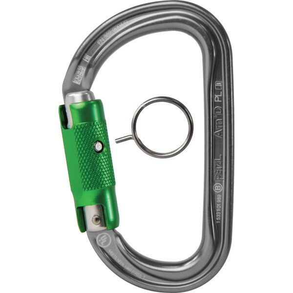 Petzl Am’D Pin-Lock, een a-symmetrische karabiner van aluminium. Dankzij de Pin Lock sluiting is deze karabiner alleen te openen met het meegeleverde ontgrendelingshulpstuk. Het is een veelzijdige karabiner, voor het bevestigen van hulpmiddelen (zoals een GriGri of Huit) aan de gordel of aan het uiteinde van een bandlus/leeflijn.